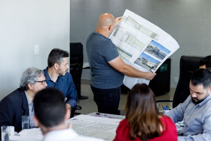 Na imagem principal o prefeito Abilio Brunini observa uma planta do projeto arquitetônico da Instituição de Longa Permanência para Idosos. Abilio está de pé e ao seu entorno em uma mesa estão os participantes do encontro que observam o desenho do projeto nas mãos do gestor.