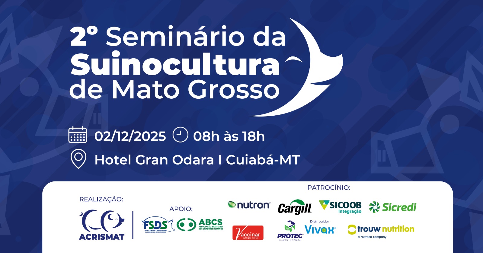 A Associação dos Criadores de Suínos de Mato Grosso (Acrismat) abriu as inscrições para o 2º Seminário da Suinocultura de Mato Grosso, que será realizado no dia 2 de dezembro, no Hotel Gran Odara, em Cuiabá (MT). O evento será exclusivamente presencial e reunirá produtores, profissionais, lideranças e especialistas do agronegócio para discutir os desafios e oportunidades da suinocultura moderna.