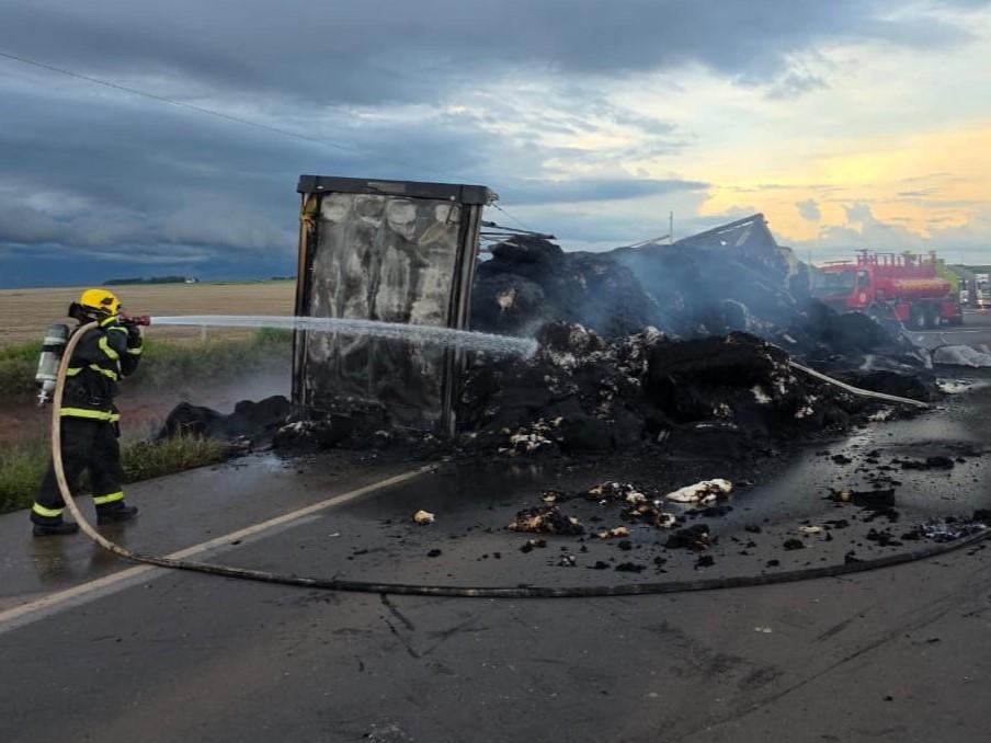 O Corpo de Bombeiros Militar de Mato Grosso combateu um incêndio em uma carreta carregada com plumas de algodão na tarde de quinta-feira (12), às margens da BR-163, em Nova Mutum.