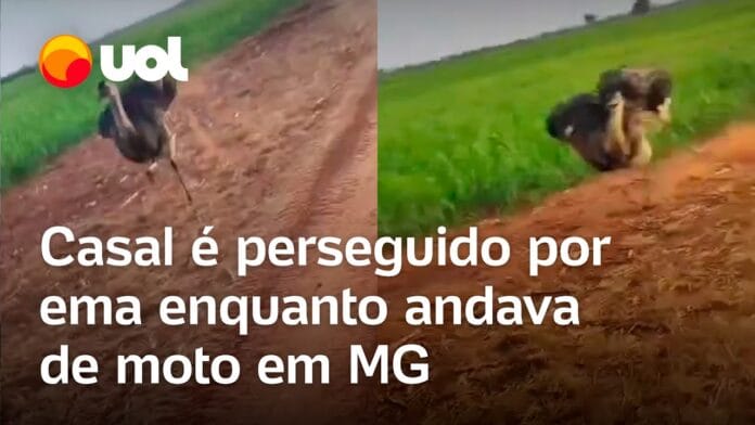 Um casal foi perseguido por uma ema enquanto andava de moto na região de Lago Grande, Minas Gerais.