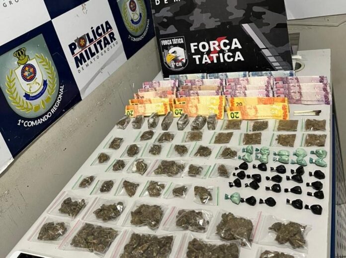 Policiais militares da Força Tática do 1º Comando Regional prenderam dois homens, de 22 e 28 anos, por tráfico ilícito de drogas, na tarde desta quinta-feira (26.6), em Cuiabá. Com os suspeitos, foram encontradas 79 porções de drogas, como cocaína e supermaconha, e uma quantia de R$265,00 em dinheiro.