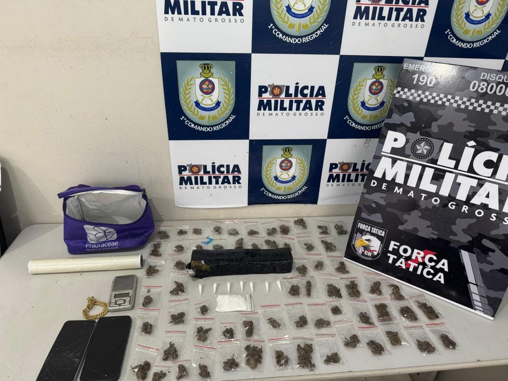 Policiais militares da Força Tática do 1º Comando Regional prenderam em flagrante dois homens, de 22 e 41 anos, por tráfico ilícito de drogas, nesta terça-feira (29.10), em Cuiabá. Com os criminosos, a PM apreendeu um tablete e 63 porções de substância análoga a maconha e porções de cocaína