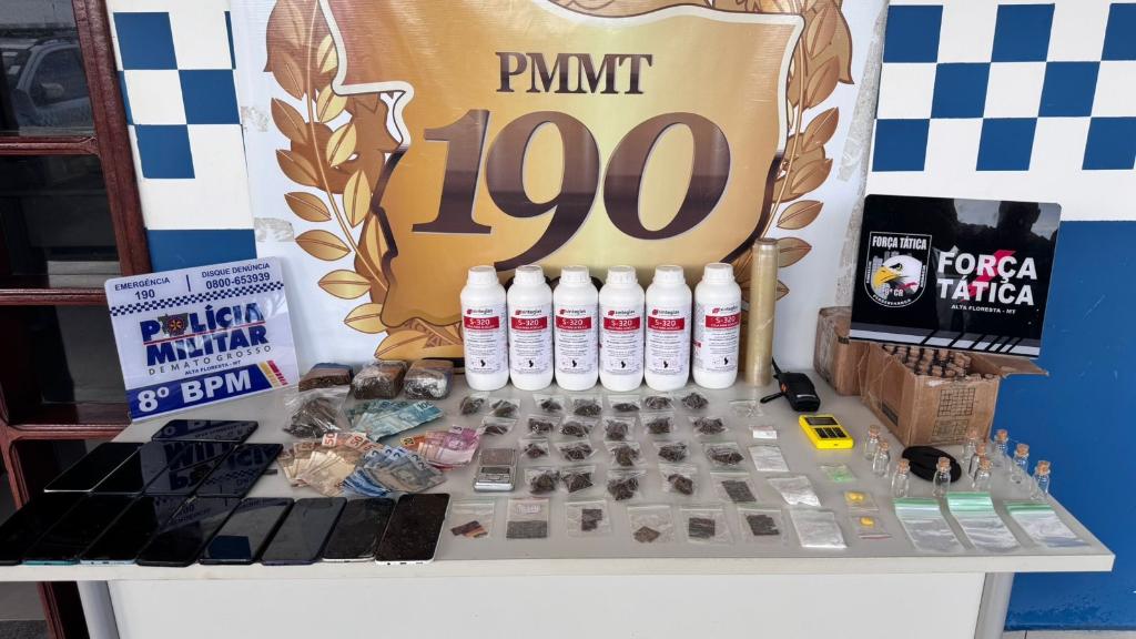 Policiais militares da Força Tática do 9º Comando Regional prenderam um homem de 27 anos e uma mulher de 32 anos, além de apreenderem um adolescente de 17 anos por suspeita de tráfico de drogas, neste sábado (14), em Alta Floresta.