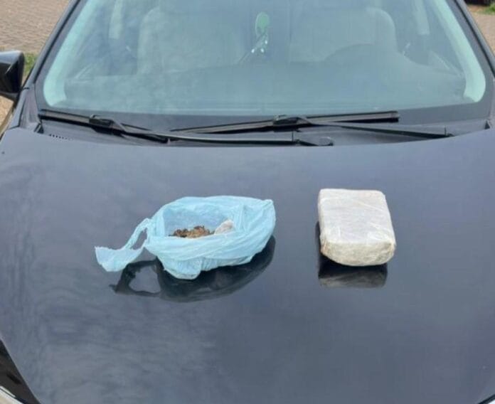 Dois quilos de maconha, sendo um tablete e outras porções, foram encontrados escondidos embaixo do banco. Os policiais ainda identificaram que o suspeito possuía um mandado de prisão em aberto.