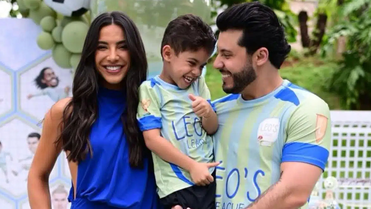 No registro, Gabriela mostrou o look escolhido para a ocasião: um vestido estampado em tons de marrom e vermelho, combinado com óculos escuros e rabo de cavalo. Léo, fruto do relacionamento de Murilo com Marília Mendonça (1995–2021), também posou sorridente, vestindo camisa de tricô e calça jeans.