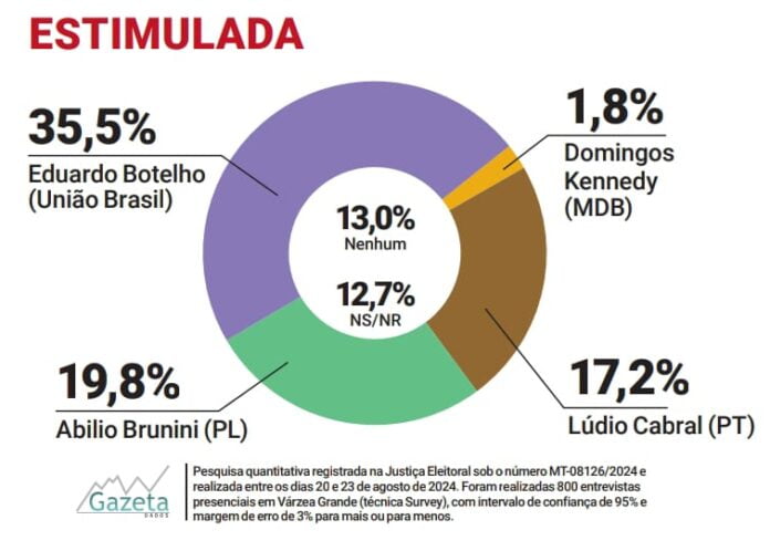 Pesquisa do instituto Gazeta Dados confirma a liderança isolada do candidato Eduardo Botelho (União) na disputa para prefeito de Cuiabá, com 35% das intenções de votos, na modalidade estimulada. O levantamento foi divulgado nesta terça-feira (27), no Jornal A Gazeta.
