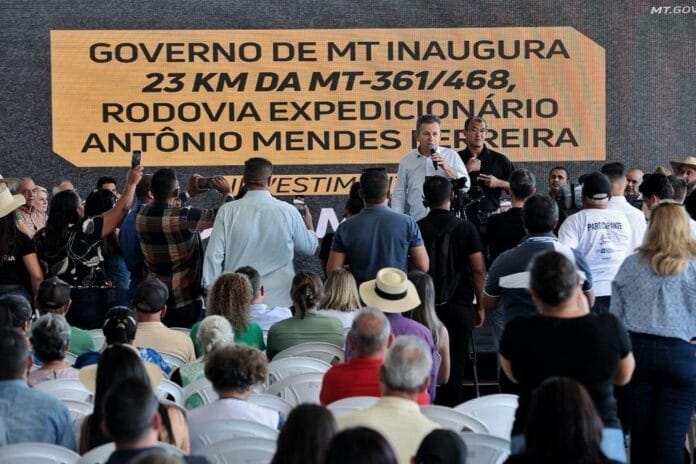 O governador Mauro Mendes se emocionou durante a cerimônia de entrega de 57 quilômetros de asfalto novo nas MTs-361 e 468, na região de Santo Antônio do Leverger, neste sábado (31.5).
