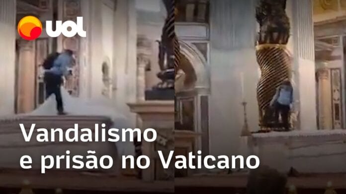 Um romeno foi preso após subir em um altar da Basílica de São Pedro, no Vaticano, e chutar um candelabro avaliado em 30 mil euros (equivalente a R$ 180 mil). Segundo as autoridades locais, ele foi detido por vandalismo e foi colocado sob custódia da polícia italiana.