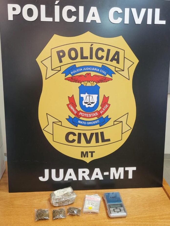 Durante o cumprimento do mandado, os policiais também flagraram o suspeito com drogas em sua casa. No local, foram encontradas diversas porções de maconha — algumas já embaladas e prontas para comercialização —, além de materiais utilizados para o preparo e embalagem de entorpecentes, como uma balança de precisão.