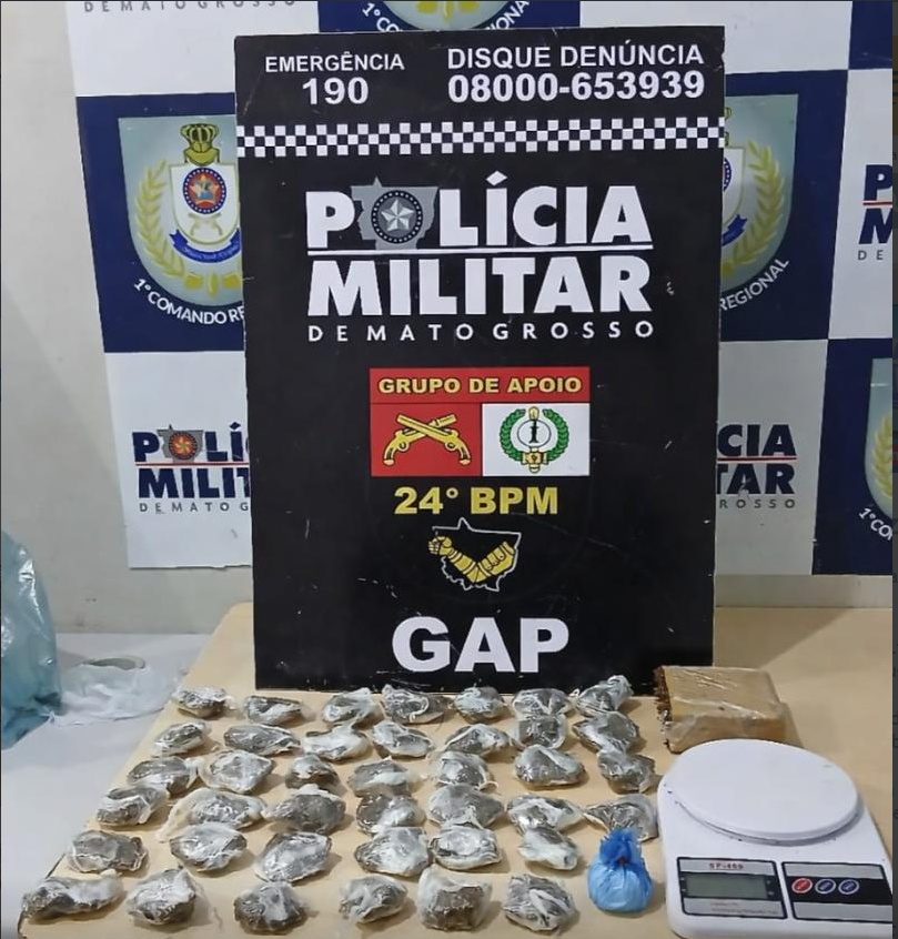 Um homem de 20 anos foi preso neste domingo (22) por tráfico de drogas, com 39 porções maconha, um tablete maior da mesma droga, uma porção de substância análoga à cocaína e uma balança de precisão no Bairro Pedra 90, em Cuiabá.