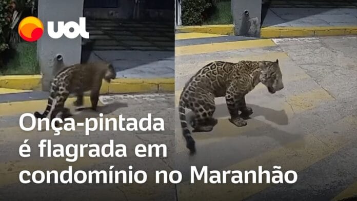 Câmeras de segurança de um condomínio em Imperatriz (MA) gravaram o momento em que uma onça-pintada passeia pela entrada da garagem. Ela chega a pular contra o portão de entrada, indo embora em seguida.