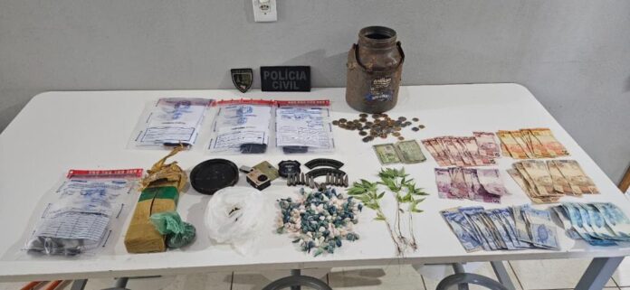 Durante a ação, as equipes policiais cumpriram um mandado de busca e apreensão em um imóvel localizado no bairro Cidade Alta. No local, os agentes encontraram e apreenderam diversas substâncias ilícitas, entre elas: