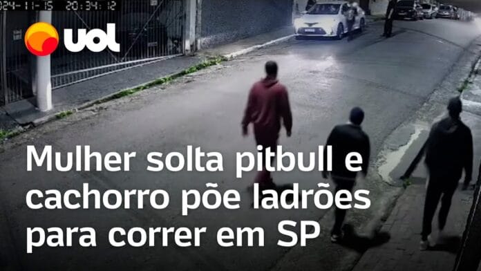 Um vídeo mostra o momento em que uma mulher solta um cão da raça pitbull na direção de homens durante um assalto. O caso aconteceu região da Penha, na Zona Leste de São Paulo, na sexta-feira (15).