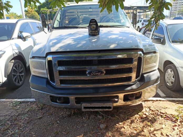 Ainda nesta quinta, os policiais militares da Força Tática receberam informações de que havia uma caminhonete modelo F-350 supostamente abandonada, na Rua Padre Dom Bosco, no bairro Água Limpa. O veículo estava com uma das placas soltas e penduradas.