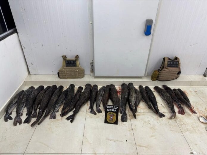 Mais de 124 quilos de pescado ilícito foram apreendidos pela Polícia Civil, na sexta-feira (06.6), em ação realizada pelos policiais da Delegacia Especializada do Meio Ambiente (Dema) em uma chácara na região de Barão de Melgaço. O pescado ilegal foi encontrado escondido em uma área de mata na propriedade apreendidos exemplares de cachara, pintado, pacupeva e piavussu.