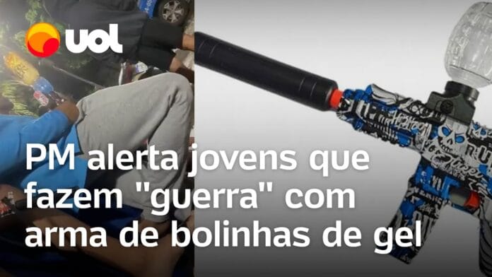 Um vídeo circula nas redes sociais em que um policial militar do Rio de Janeiro alerta jovens que fazem “guerra” com arma de bolinhas de gel.