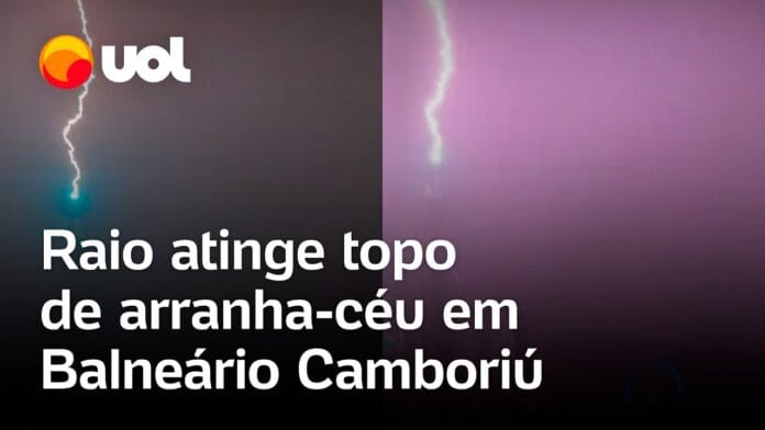 Um vídeo registrou o momento em que um raio atingiu o topo de um arranha-céu em Balneário Camboriú, Santa Catarina, na noite de domingo (9).