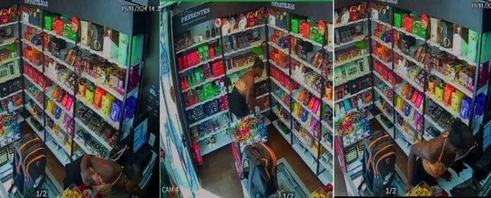 Nas imagens, é possível ver o momento em que a mulher aproveita o momento em que a funcionária deixa o espaço, vai até uma das prateleiras e pega um objeto. Na sequência, ela abre a mochila pra esconder o produto. Em seguida, ela repete a ação criminosa.