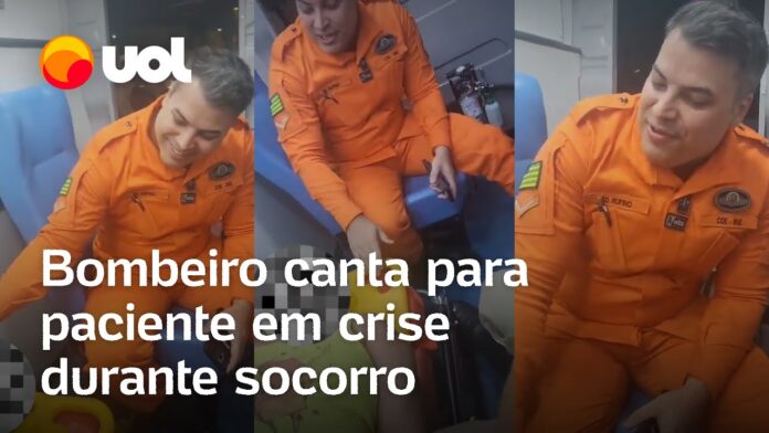 Bombeiro militar emociona ao cantar dentro de ambulância para acalmar paciente em crise. A imagem viralizou nas redes sociais ao mostrar o atendimento.
