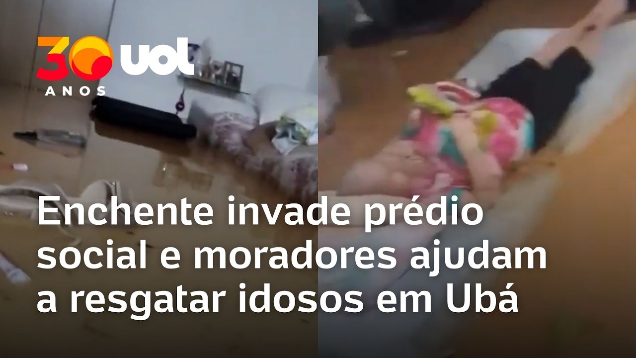 Enchente invade prédio social e mobiliza moradores para resgatar idosos em Ubá (MG). A enxurrada atingiu o Departamento de Assistência Social João de Freitas, no Centro da cidade, durante as fortes chuvas. Com a água avançando rapidamente, vizinhos ajudaram a retirar os idosos atendidos no local e levá-los para o segundo andar do imóvel, onde a água não chegou.