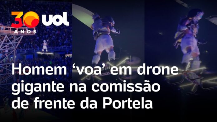 A comissão de frente da Portela colocou um dos integrantes “voando” em um drone durante o desfile na Sapucaí, no Rio de Janeiro, neste domingo (15).