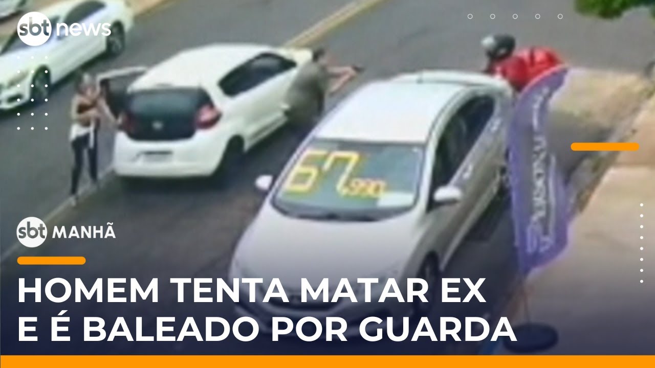 Uma câmera de segurança flagrou o momento em que um motociclista armado tenta matar a ex-mulher a tiros em Campinas, interior de São Paulo. O homem, com mochila de entregas, atira contra o carro de aplicativo onde a vítima estava. Um guarda municipal de folga reage e atinge o agressor, que foi levado ao hospital. A ex-esposa e o motorista não se feriram. O caso é investigado pela polícia.