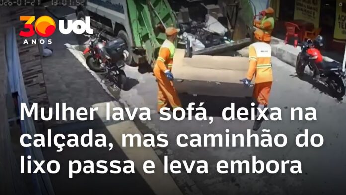 A confeiteira Fabiana Correia entrou para casa enquanto esperava o sofá secar. Na sequência, os coletores passaram e jogaram a mobília dentro do caminhão de lixo.