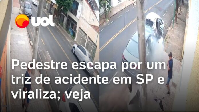 Um carro ficou desgovernado e colidiu contra um poste de energia elétrica em Birigui, interior de São Paulo. Imagens de circuito de segurança mostram o veículo seguindo em alta velocidade, enquanto um pedestre caminhava pela calçada e, por pouco, não foi atingido.