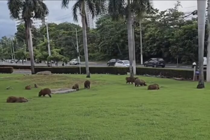 Capivaras já fazem parte da rotina na região do Centro Político Administrativo de Cuiabá. Elas são vistas atravessando avenidas ou pastando nos gramados próximos ao Parque das Águas e à Assembleia Legislativa de Mato Grosso. A convivência com os animais chama a atenção de quem passa pelo local diariamente.