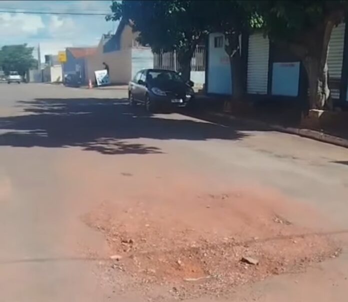 Um comerciante reclama de um buraco no asfalto na rua Diamantino, no bairro CPA 1, em Cuiabá. Segundo ele, o problema foi deixado após serviço da Concessionária Águas Cuiabá. A situação tem causado transtornos a moradores e motoristas da região.