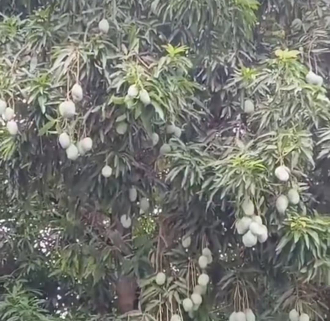 Em Cuiabá, a fartura de mangas chama a atenção. Um vídeo registrado mostra uma árvore completamente carregada com as frutas, retratando a abundância típica da estação.