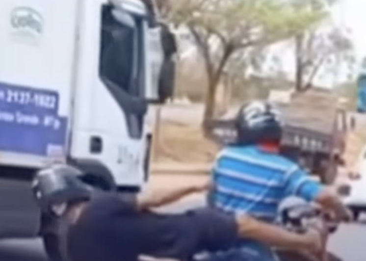 Em Sinop (MT), um homem foi flagrado na garupa de uma motocicleta aparentemente embriagado e quase perdeu o equilíbrio durante o trajeto. O condutor precisou segurá-lo para evitar a queda e garantir a segurança de ambos.