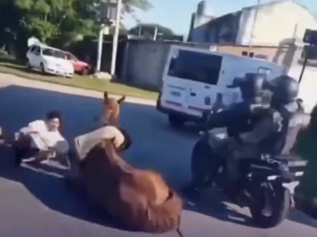 Uma perseguição policial na província de Buenos Aires terminou de forma inusitada e impressionante. Câmeras flagraram um policial se jogando da viatura em movimento para derrubar dois suspeitos que fugiam a cavalo. Segundo a imprensa local, os jovens, menores de idade, teriam roubado o animal e foram capturados.
