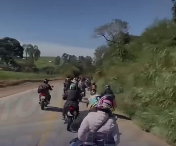 Durante uma romaria de motociclistas em Silvianópolis (MG), um motociclista perdeu o equilíbrio ao fazer manobra perigosa em faixa contínua, esbarrou em outro e foi lançado contra um caminhão. Apesar da colisão, ele passa bem.