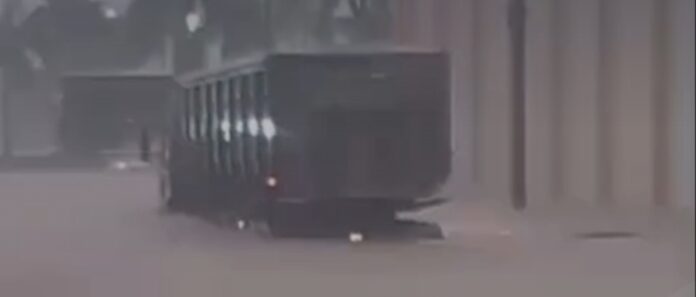 Morador registra rua totalmente tomada pela água após fortes chuvas. Um caminhão tenta atravessar o trecho alagado, evidenciando o perigo. A situação alerta para riscos durante períodos de chuva intensa.
