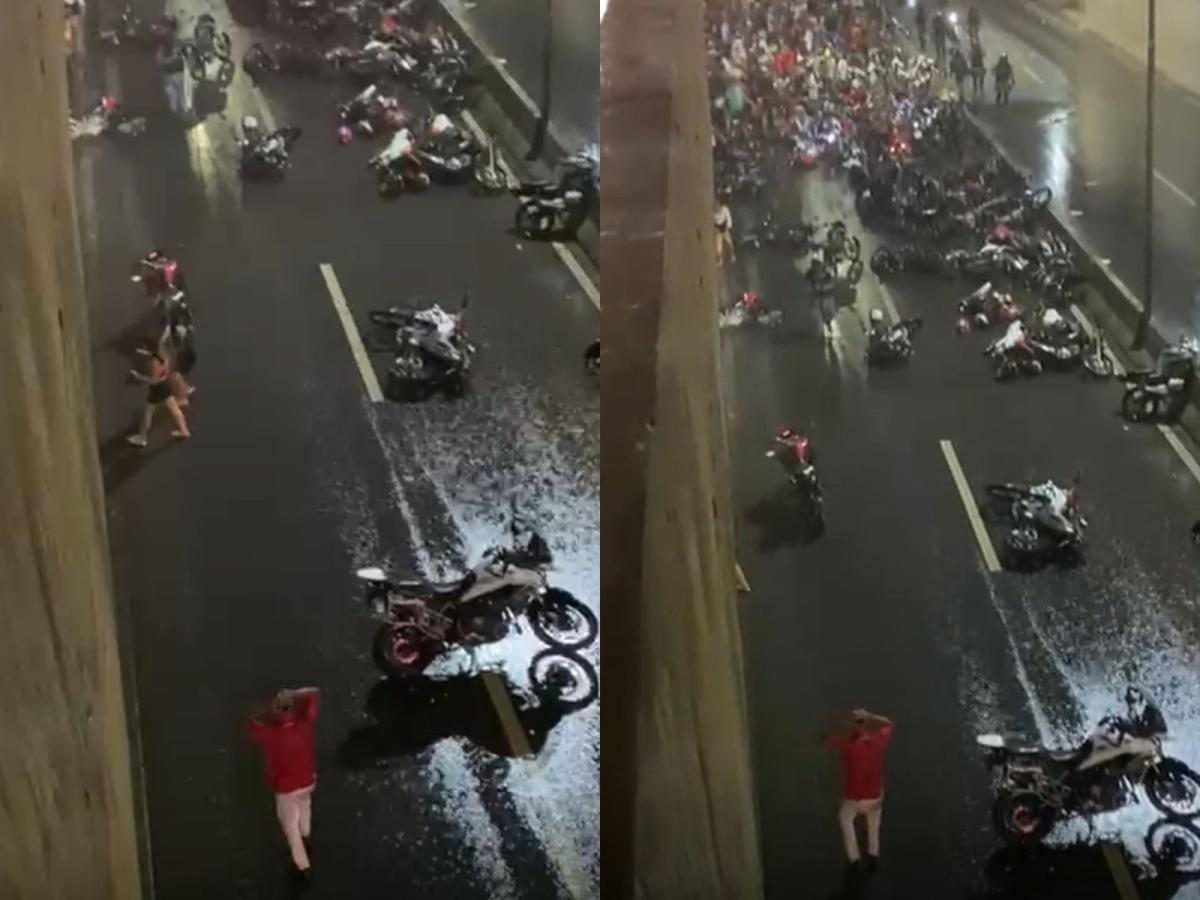 Quando os motoqueiros avistaram a polícia, tentaram fugir pelo canteiro central, pulando a barreira entre uma via e outra. Alguns chegaram a cair e outros, usaram as motos para atacar os policiais.